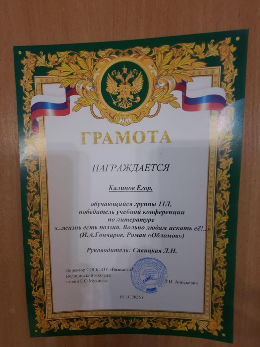 8 октября для студентов первых курсов  прошла учебно- практическая конференция " Жизнь есть поэзия. Вольно людям искажать её!.." ( И. А . Гончаров. Роман " Обломов"). Победителем конференции стал обучающийся группы 11Л Калинов Егор. Организатор и руководитель: преподаватель русского языка и литературы Савицкая Л.Н.