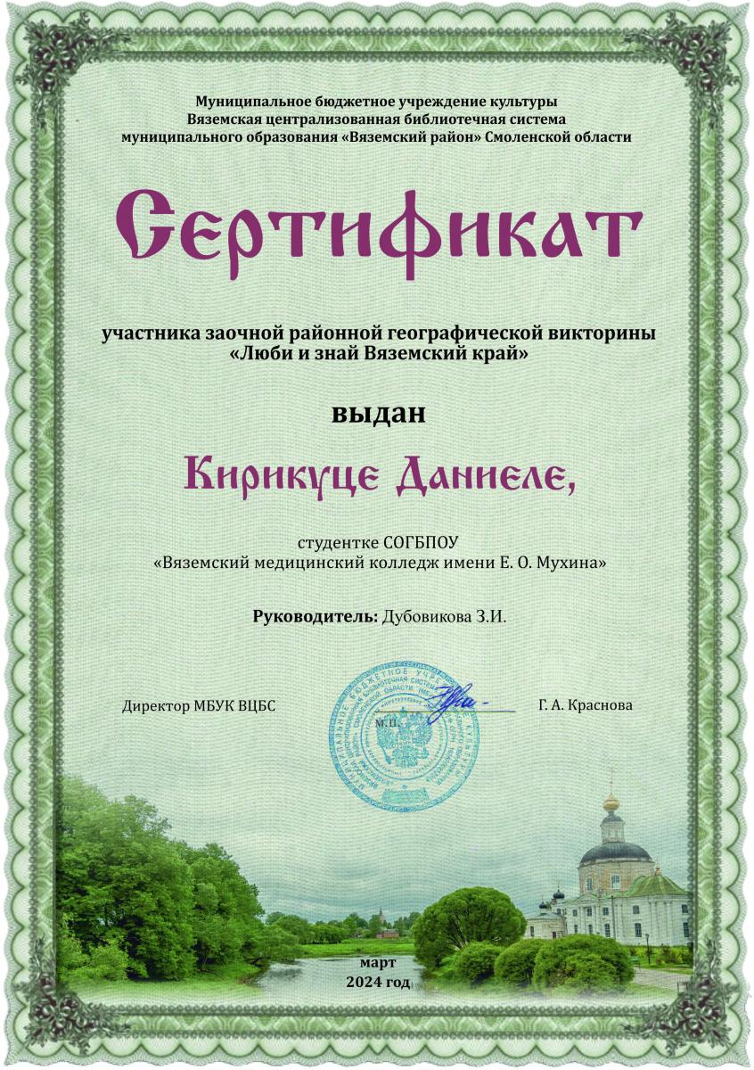 С 22 апреля по 14 мая 2024 года проводилась районная заочная географическая Викторина «Люби и знай свой край». В ней приняли участие студенты СОГБПОУ «Вяземского медицинского колледжа имени Е.О.Мухина», Бакина Софья, Ахматова Мария и Кирикуца Даниела, котрык нагрждены дипломами и сертификатами.