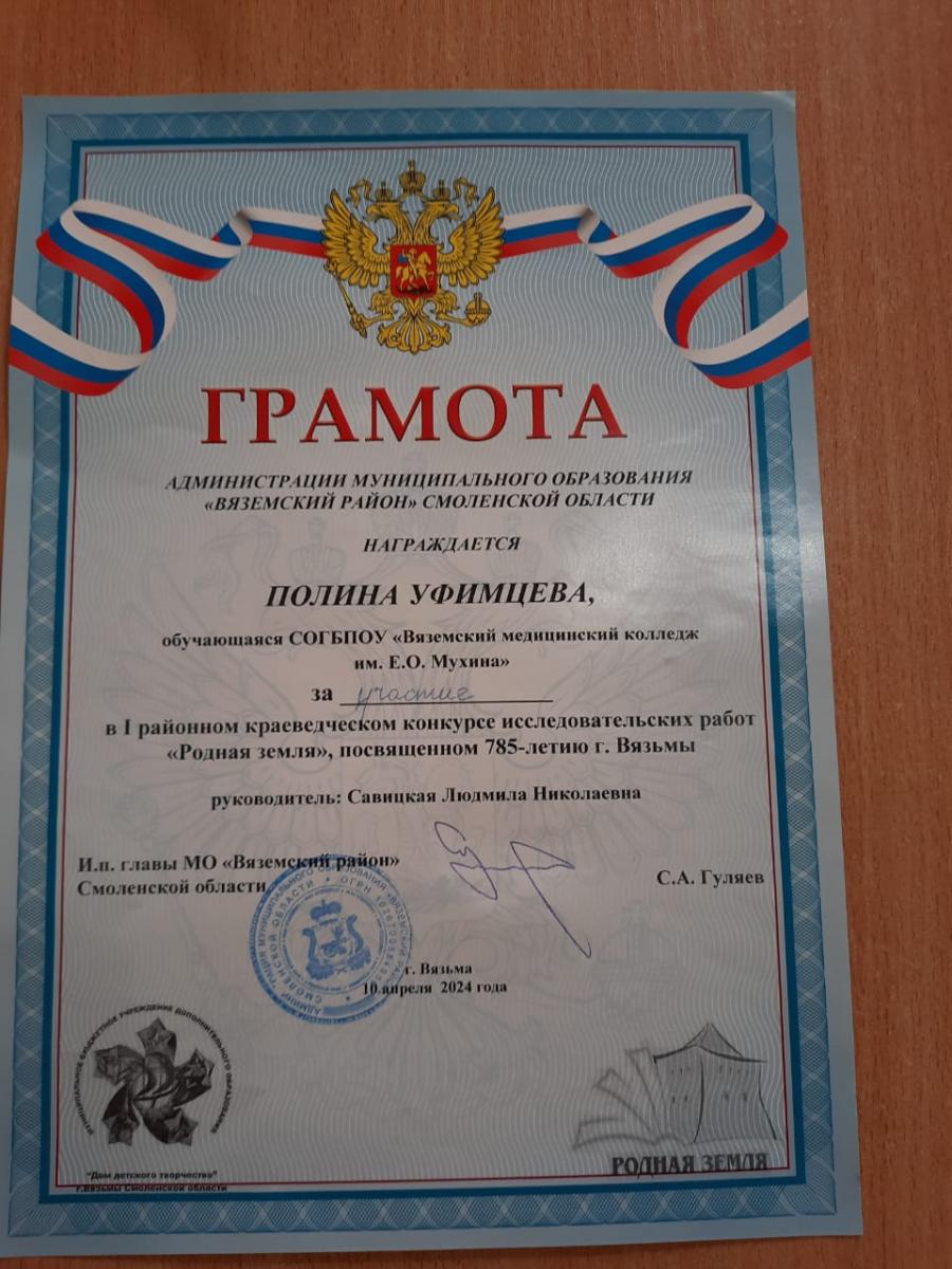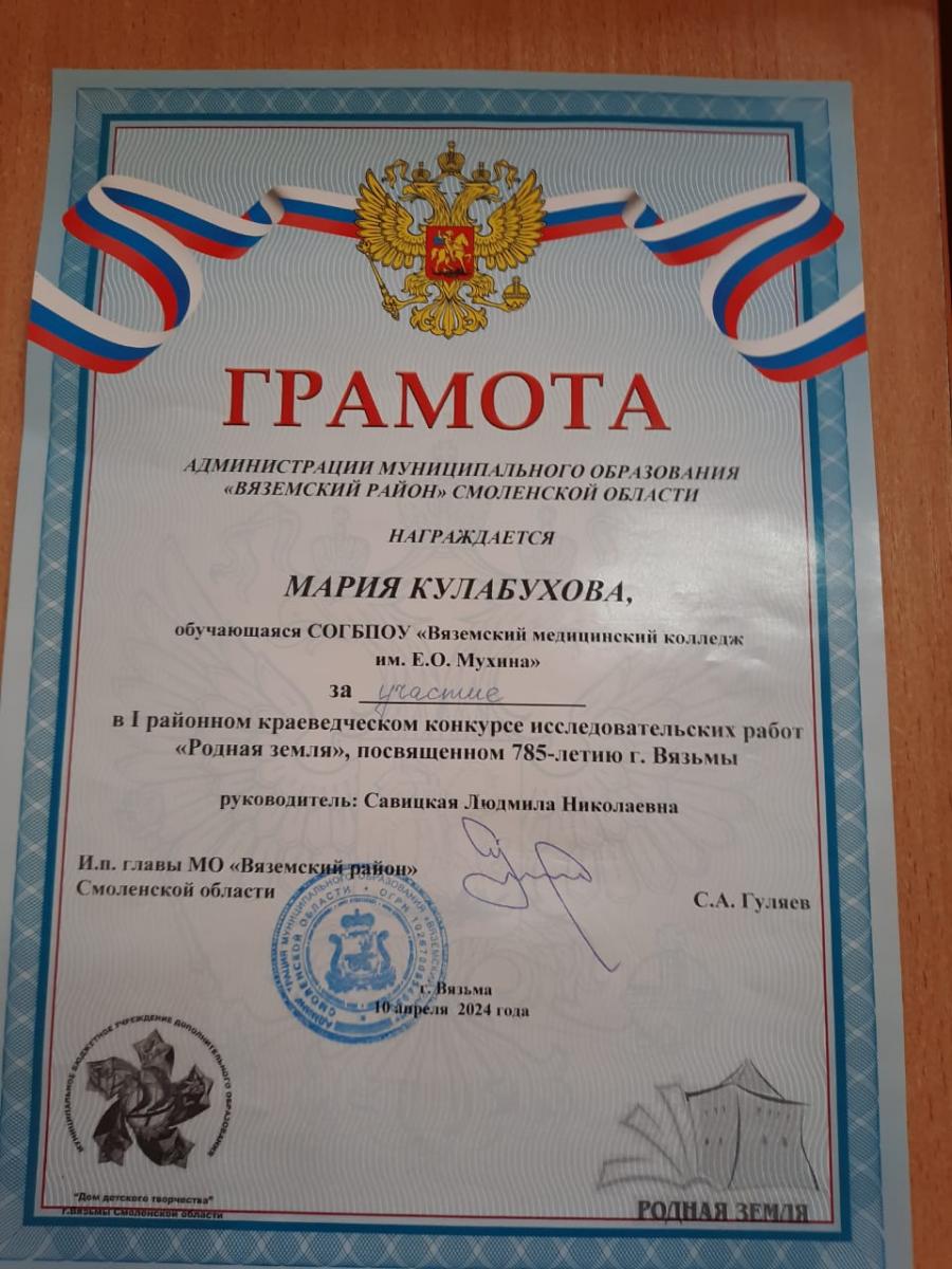 "Родная земля" - это 1 районный краеведческий конкурс исследовательских работ, посвящённый 785-летию г.Вязьмы. В нем приняли участие студенты нашего колледжа и получили Грамоты Администрации МО "Вяземский район"  Смоленской области. Это Кулабухова М.(гр.11С), Уфимцева П.(гр.12С) , Костина Л.(гр.1Ф).